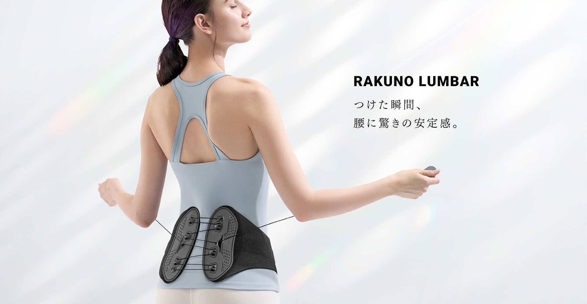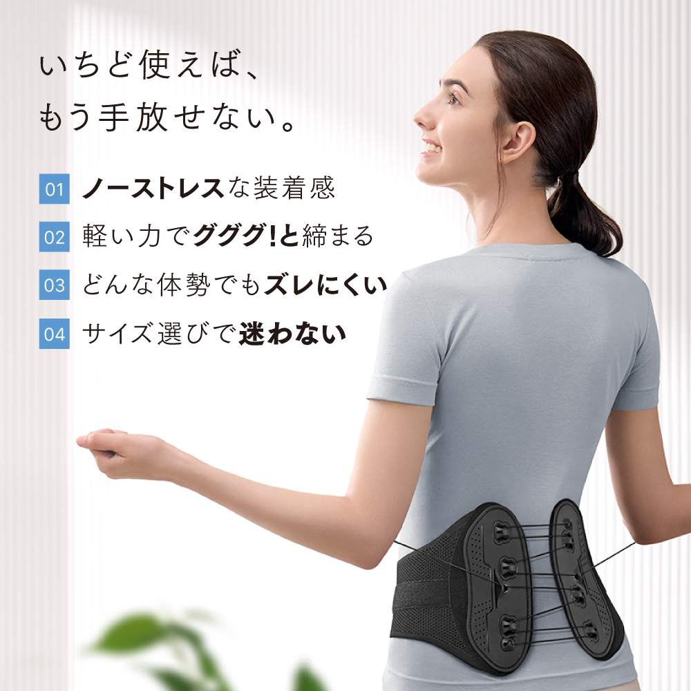 巻きつけて軽く引っ張るだけで、強力に体をサポートする腰ベルト。次世代滑車採用により、驚きの軽さと薄さを実現。薄くて目立たないので、人目を気にせずさまざまなシーンで使えます。