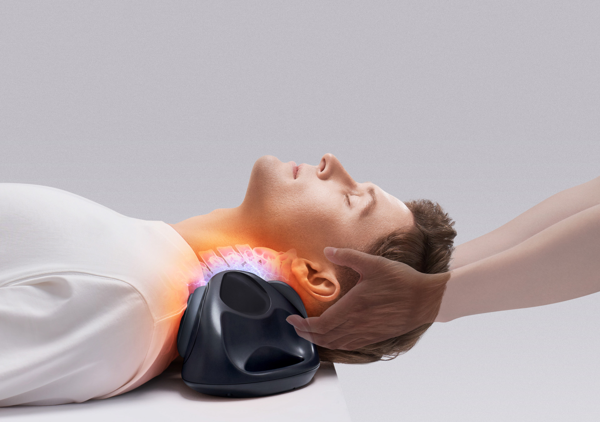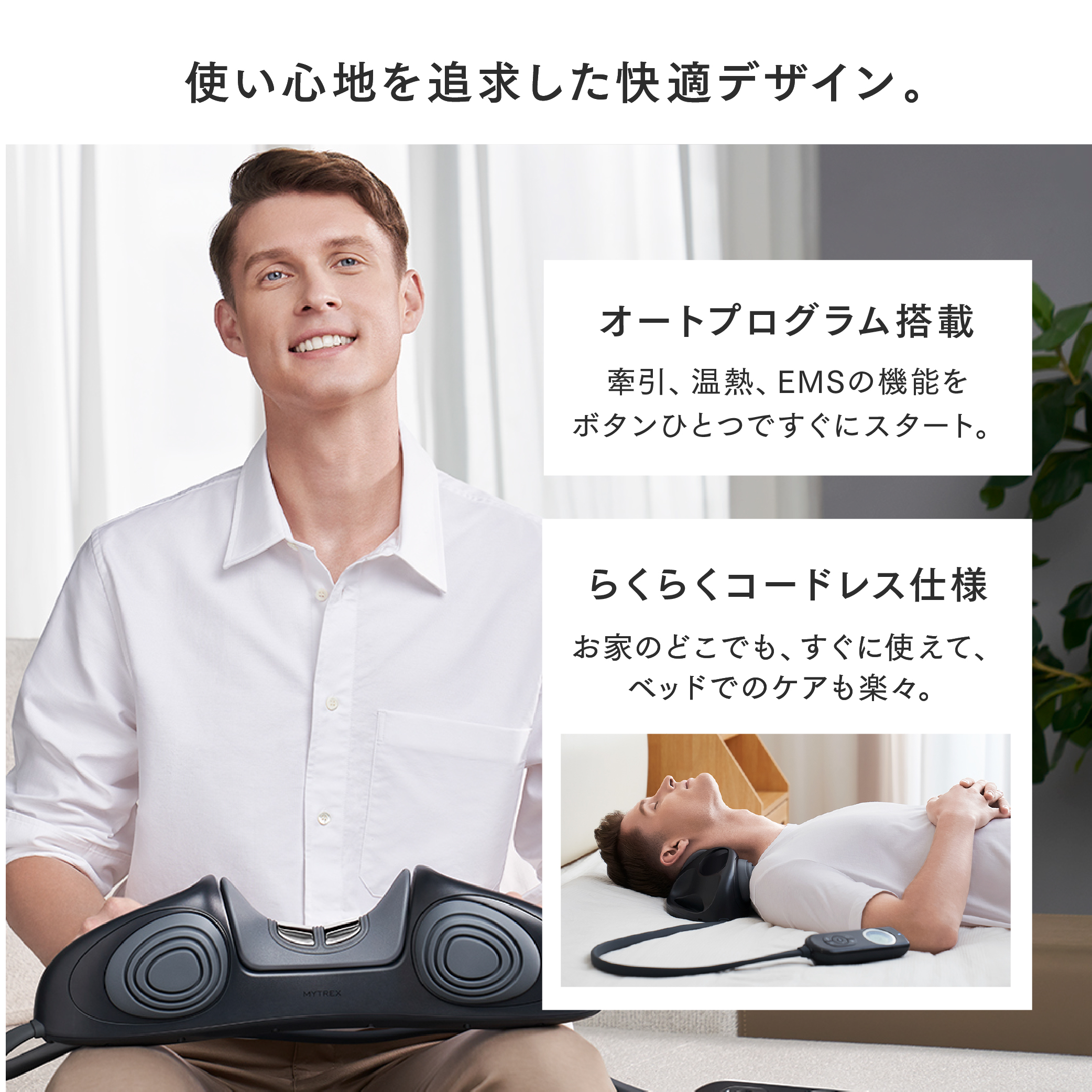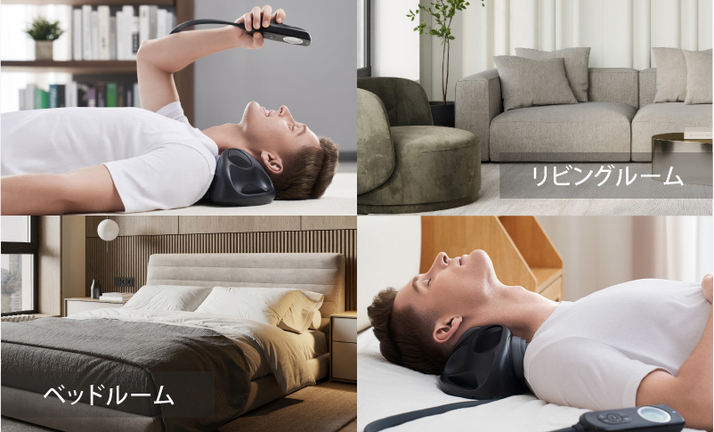 自宅でいつでも本格的なケアを体感できる、首の“付け根”特化のネックストレッチャーが誕生しました。縦に引っ張るように首を伸ばすことで、つらい詰まり感を解放。さらに、EMSで筋肉を緩め、温熱で緊張をほぐします。コードレスでコンパクトな設計なので、ベッドの上など使う場所を選ばないでご使用いただけます。
